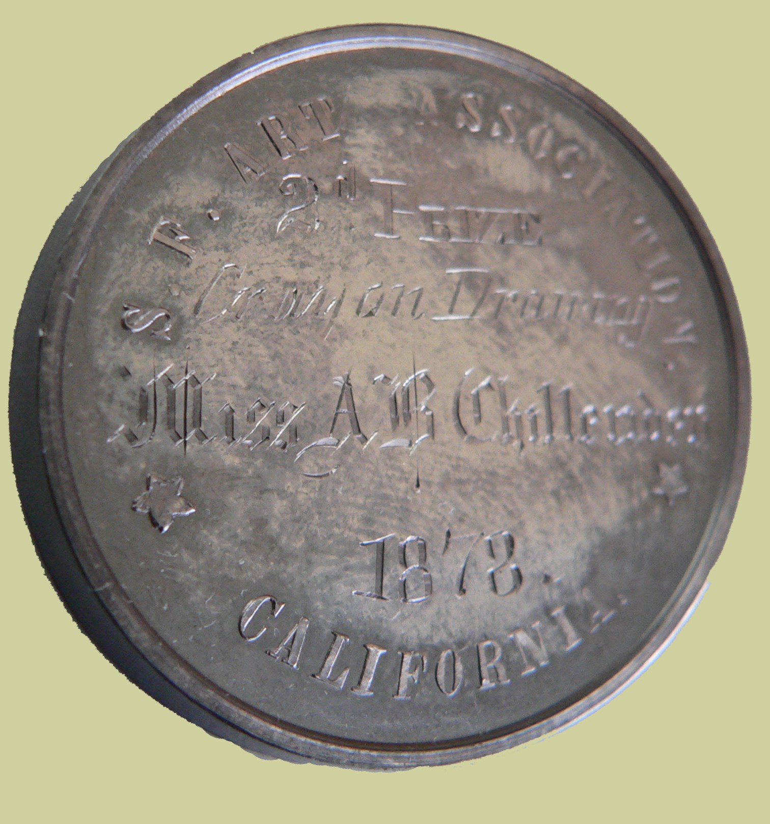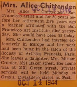 Alice Brown Chittenden was an early California artist who lived from 1859 to 1944. She lived in San Francisco all of her life. She was briefly married to Charles P. Overton in 1886 and had one daughter Miriam Cronier (nee Chittenden) and one granddaughter Alice Virginia Larribeau (nee Cronier). Click here to see the Wikipedia article about her. Her parents settled in San Francisco in 1858. Her mother made the long trip to Brockport, New York to await Alice's birth because she felt that San Francisco was "no fit" place for her to deliver a baby. She returned to San Francisco with her two month old infant by sailing to Panama, crossing the Isthmus by train, and connecting with another ship.