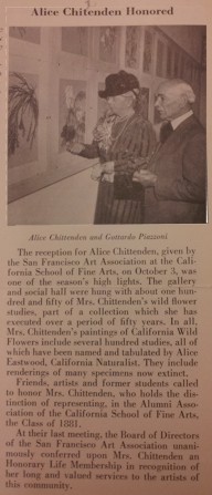 Alice showed her artistic talent early. She made a perfect drawing of a rose at the age of five. After graduating from Denman Grammar School in 1876 winning a silver medal for being at the top of her class, she studied drawing and painting under Virgil Williams at the Art School. Her portraits, landscapes, and flower studies were popular in the California art world and she exhibited at the Paris Salon in 1908. She was an instructor at the California School of Fine Arts for almost 50 years. The "Art School" changed names and associations several times during this period. At one time it was affiliated with the University of California, which made Alice Chittenden the first woman faculty member of the University of California. This school is now known as the San Francisco Art Institute. It has contributed papers to this web site that include, articles from its Bulletin dated September 1938, June-July 1941, and October-November 1941. It also provided an article published in August 1941 from the Club Magazine of the Women's City Club of San Francisco. It also provided the announcement for an exhibit of her wildflower paintings shown at the left along with the response to a query from the Huntington Library and some letters that she wrote to the school. She had a lifetime project of making botanical studies of California wildflowers, which resulted in 256 paintings identified by both popular and botanical names. Her mentor in this effort was Alice Eastwood, Curator of Botany at the California Academy of Sciences in Golden Gate Park. The two trunks containing these paintings were stored in the basement of the Academy when World War II broke out. They were sold to the Elizabeth Hay Bechtel in the 1960s. A few of these botanical studies of California wildflowers can be seen on this web site. An inventory is also available on this web site. The local California newspapers wrote numerous articles about her. You can see links to news articles from a list provided by the California Historical Society. There is an additional article from 1885. Her daughter contested her father's will in 1917. You can see the articles from the San Francisco Examiner and the San Francisco Chronicle covering this trial. Her husband, Charles P. Overton, was vice president and manager of the Union Fish Company, which is still in business today. The Union Fish Company provided some of its corporate papers mentioning Charles P. Overton including an article he wrote, corporate minutes following the 1906 San Francisco earthquake and fire, and corporate minutes following his death in 1914.. The California Historical Society held an exhibit of these botanical studies in 1965 before they were sold. It issued a press release and developed a profile of Alice B. Chittenden. After the paintings were sold, Elizabeth Hay Bechtel arranged for them to be shown at the Marin Art and Garden Center in 1971. There is a letter from John Thomas Howell of the California Academy of Sciences to Mrs. Bechtel along with a note describing his experiences with these paintings. More information about her life is available in a remembrance written by her granddaughter, Alice Virginia Larribeau (nee Cronier) can be seen by clicking here. You can also see photos of Alice B. Chittenden by clicking here. Click here to see excerpts from her scrapbook, which was donated to the Smithsonian by her granddaughter. It includes a number of newspaper articles about her as well as her marriage certificate. She won silver medals in 1875 and 1878 and a gold medal in 1891.
